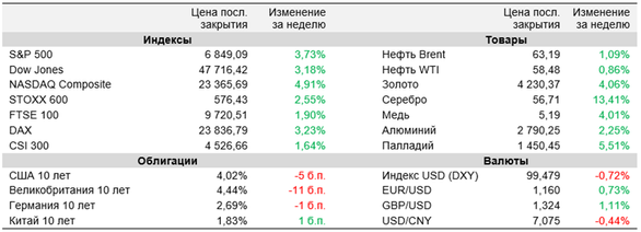 Основные мировые фондовые рынки заметно выросли в последнюю неделю осени, хотя американские S&P 500 и Nasdaq при этом завершили в минусе волатильный ноябрь в целом, а Dow Jones практически не изменился за прошлый месяц. Поддержку акциям в последние дни продолжали оказывать ожидания дальнейшего смягчения монетарной политики в Штатах после довольно «голубиных» комментариев ряда чиновников ФРС, а также неоднозначных экономических данных по стране. Так, по данным CME FedWatch, сейчас трейдеры оценивают почти в 88% вероятность снижения ключевой ставки Федрезервом на очередные 25 б.п. на заседании в этом месяце, тогда как месяц назад эта оценка составляла 63%. Кроме того, улучшению настроений инвесторов способствовали и выходившие весьма оптимистичные прогнозы по рынку от ведущих инвестдомов, включая JPMorgan, Morgan Stanley, HSBC и других, предполагающие рост индекса S&P 500 в следующем году до 7500-8000 пунктов. В числе драйверов эксперты называли сохранение «бума» в сфере ИИ, устойчивость американской экономики, продолжение роста корпоративных прибылей, масштабные программы buyback, дальнейшее снижение ключевой ставки. Отметим, что рост последних дней возглавляли акции ведущих технологических компаний США, которые попали под сильную распродажу до этого. Начавшаяся неделя вновь будет довольно скудной на важные экономические события. Инвесторы продолжат следить за увеличивающимся потоком макроданных по Штатам, в частности, интерес будет представлять отчет о доходах и расходах американских граждан за сентябрь, в рамках которого будет опубликован базовый ценовой индекс расходов на личное потребление (Core PCE), «любимая» мера инфляции Федрезерва. Также участники торгов будут оценивать немногочисленные квартальные отчетности компаний.