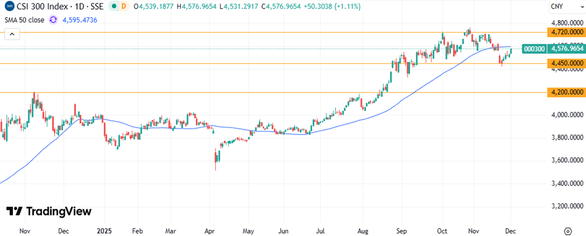 На дневном графике CSI 300 отскочил от нижней границы локального горизонтального канала 4450-4720 пунктов. Если индексу также удастся пройти 50-дневную скользящую среднюю, проходящую вблизи 4600 пунктов, можно будет рассчитывать на продолжение подъема к верхней границе фигуры.