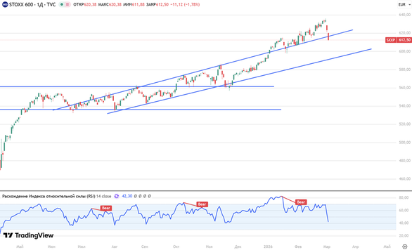 Европейские рынки сегодня находятся в режиме risk-off: инвесторы сокращают позиции в акциях на фоне роста геополитической премии и скачка энергоносителей, при этом ключевым драйвером остается газ — утренний TTF поднимался до $616 за тыс. куб. м против $531 на закрытии понедельника, и эта динамика подрывает ожидания быстрого смягчения денежно-кредитной политики в Европе, усиливает инфляционные риски и ухудшает прогнозы по маржинальности энергоемких отраслей.