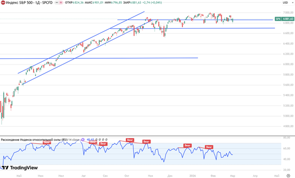 Индекс S&P 500 продолжает колебаться у верхней границы канала 6700 — 6860 без значимых изменений, учитывая мировую обстановку, вероятно возвращение к нижней границе канала уже в ближайшее время.
