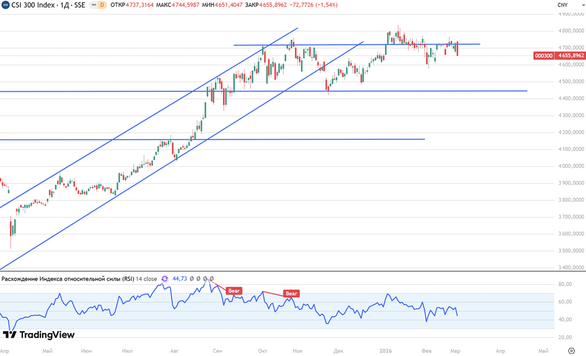 Китайский индекс CSI300 на дневном графике сегодня снова отскочил вниз от верхней границы бокового движения на фоне геополитического негатива. В случае продолжения негатива мы, вероятно, увидим продолжение снижения к нижней границе в значении 4450 п.